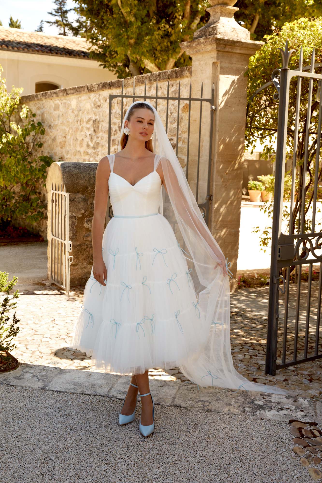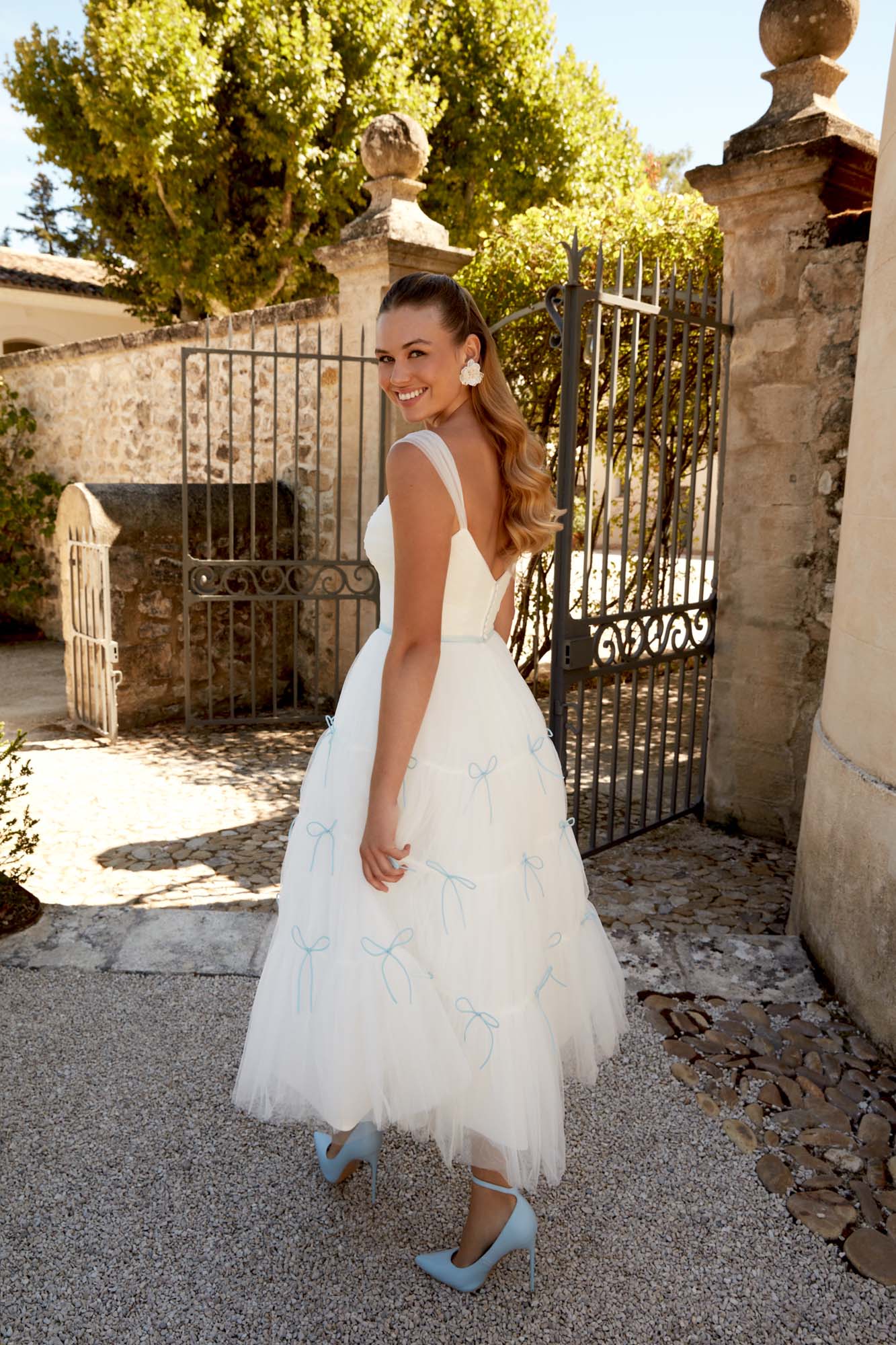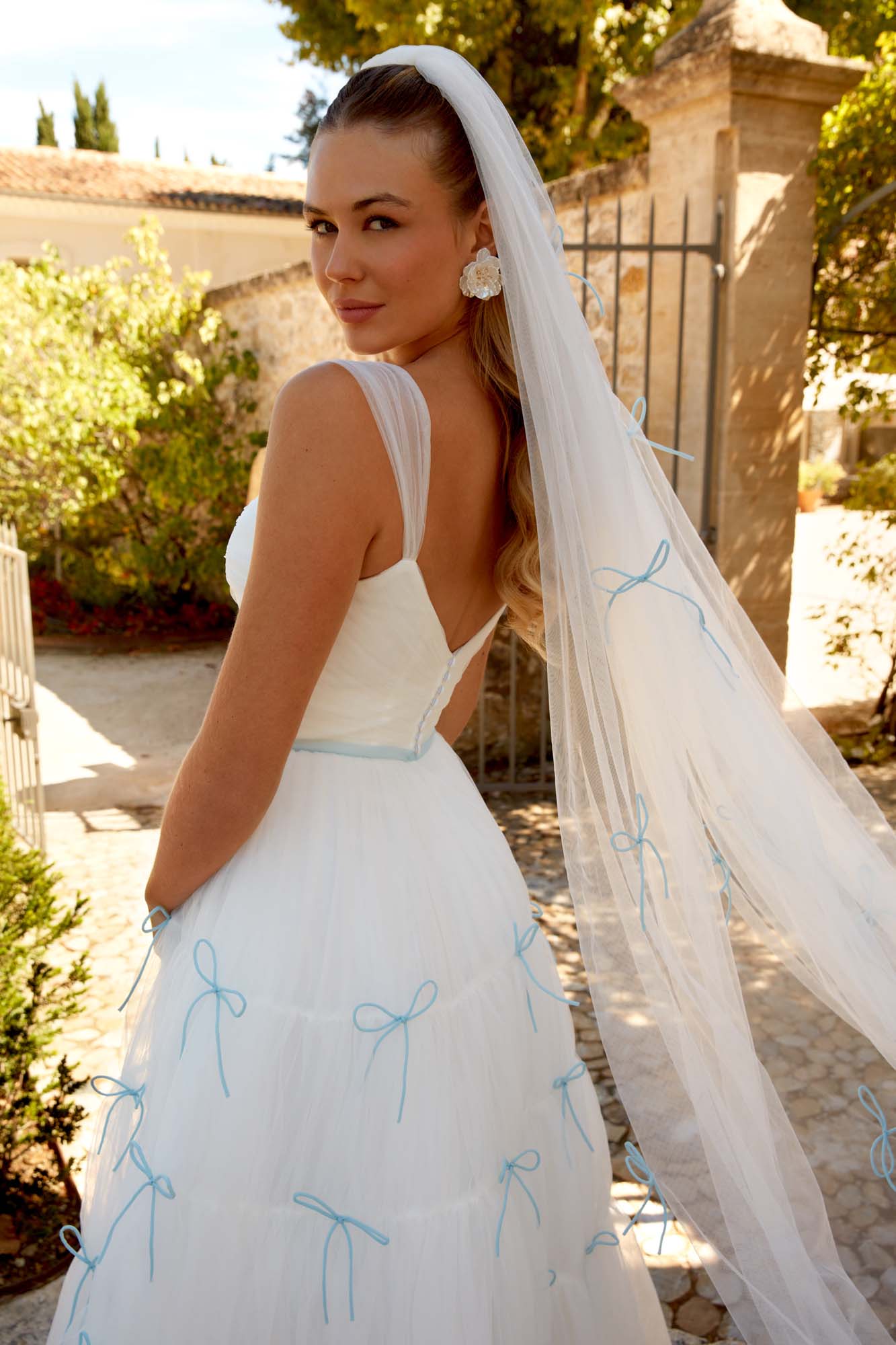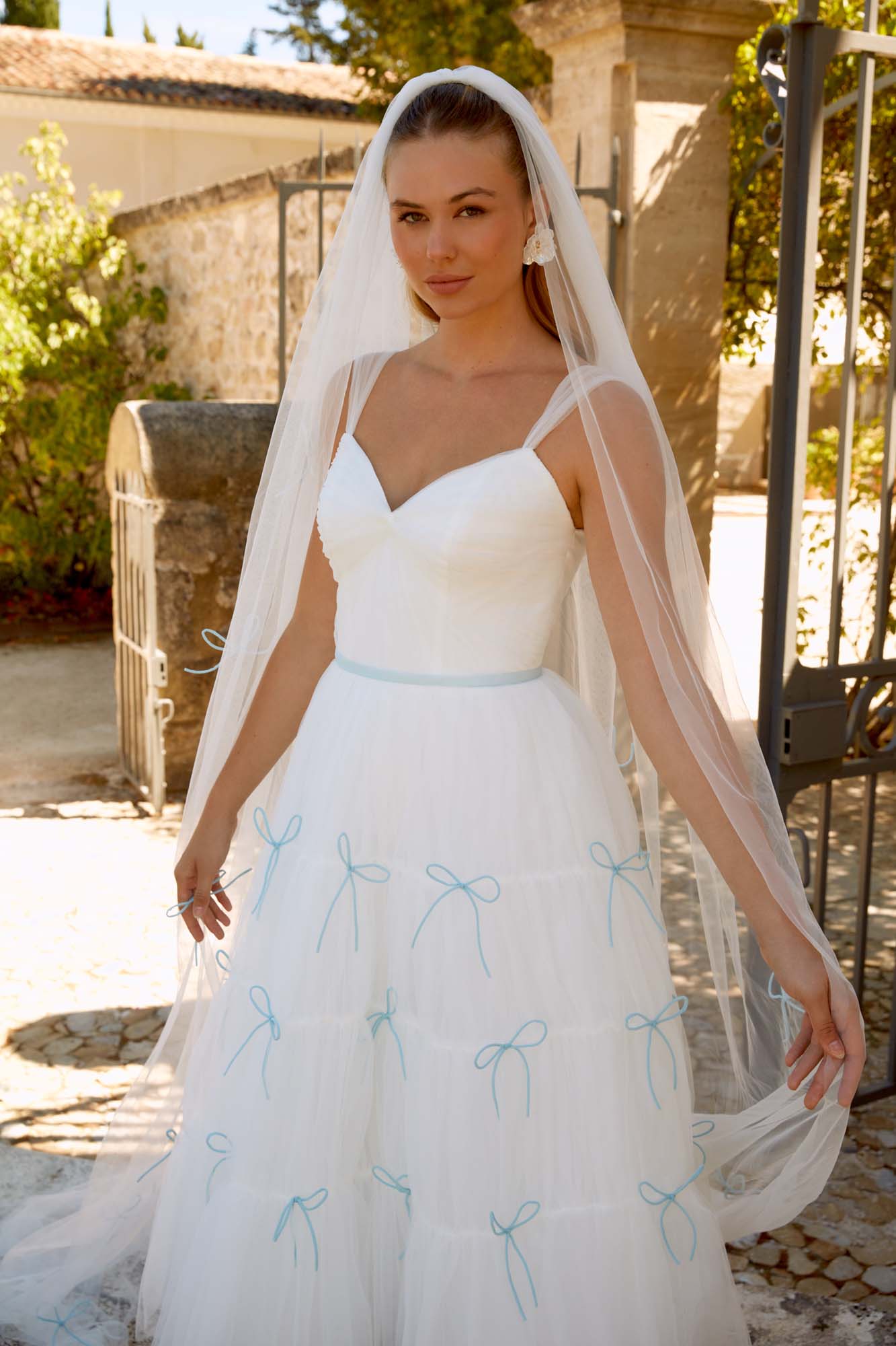 DESCRIPTION : Dress in Full Length with Bows FABRIC : Tulle, Tulle, Hard Net, Thick Woven Lining, Tulle OPTIONS : L