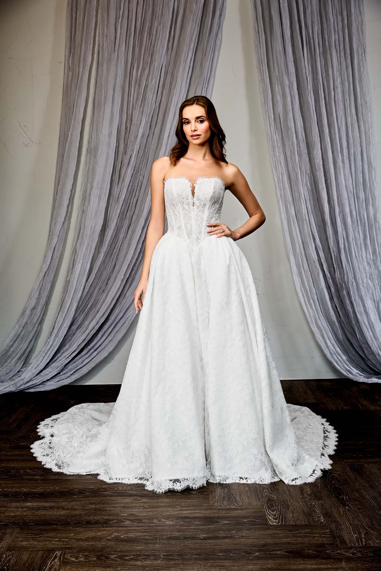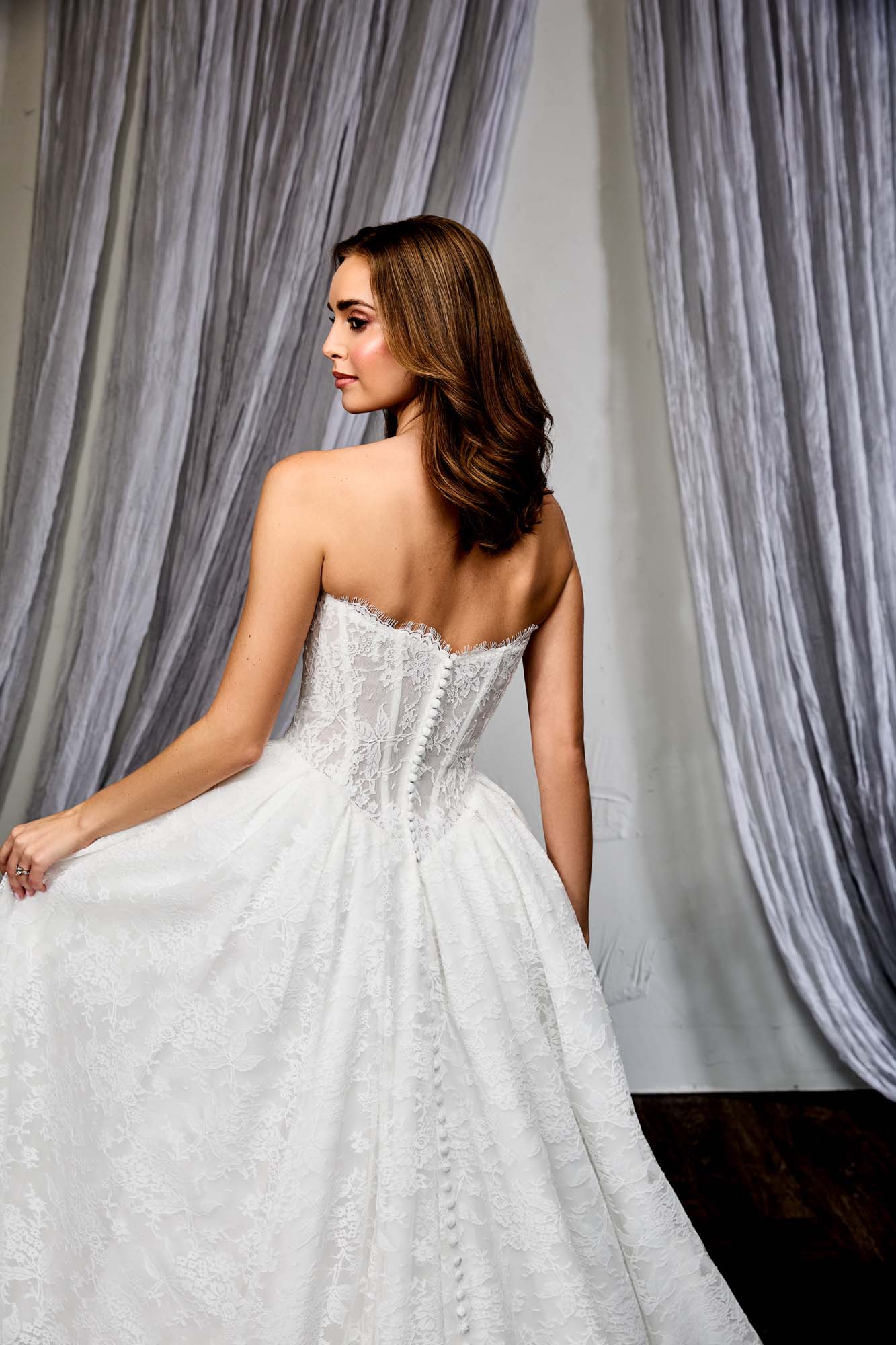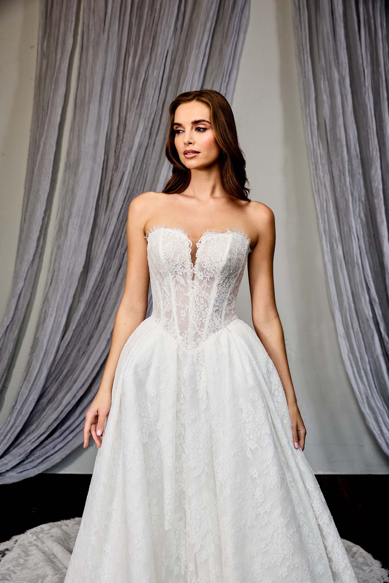 DESCRIPTION : Dress with Closed Neckline and Fully Lined Bodice FABRIC : Hard Net, Allover Chantilly Lace, Thick Woven Lining OPTIONS : L, U