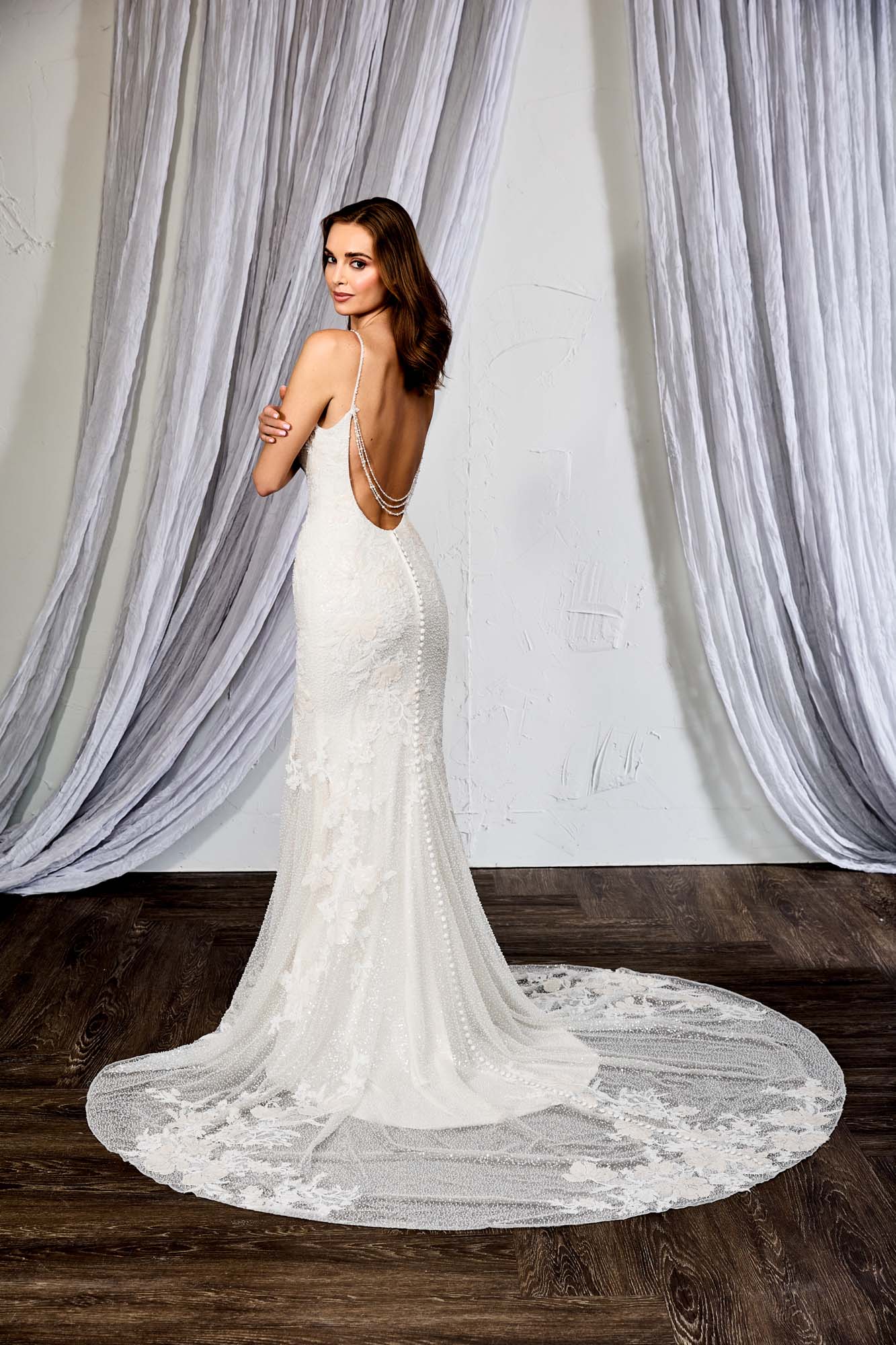 DESCRIPTION : Dress & Detachable Beaded Cowl FABRIC : Beaded and Sequined Lace Appliques, Tulle, Jersey Lining, Jersey Lining, Fusible Interlining, OPTIONS : L, PT