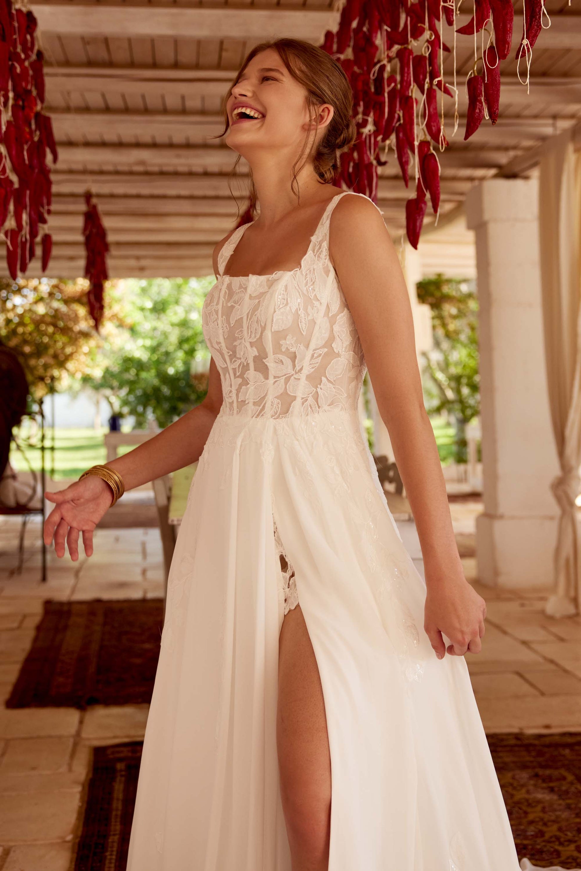 Dress with Unlined Bodice and without Skirt Slit FABRIC : Chiffon, Charmeuse, Tulle, Sequined Embroidered Chiffon Appliques Options : L