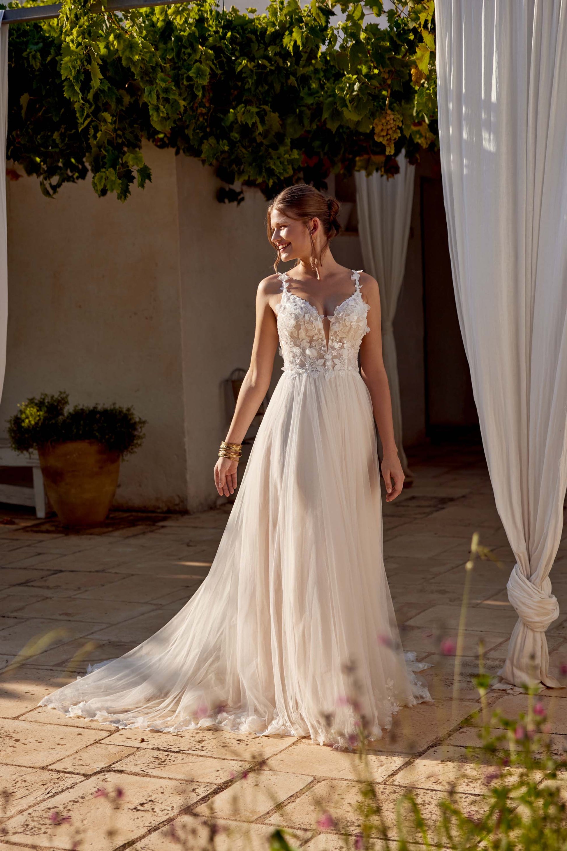 Dress with Lined Front Bodice and Plunging Neckline FABRIC : 3D Lace Appliques, Tulle, Chantilly Lace, Beaded and Sequined Lace Appliques Options : U