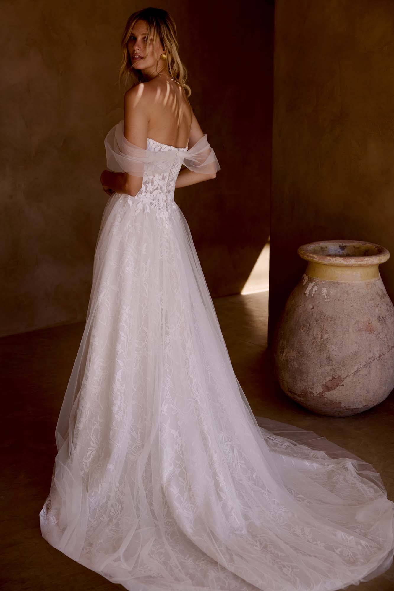 DESCRIPTION : Dress Only with Plunging Neckline and Fully Lined Bodice FABRIC : Matte Lace Appliques, Tulle, Woven Lining, Tulle, Chantilly Lace OPTIONS : L, U