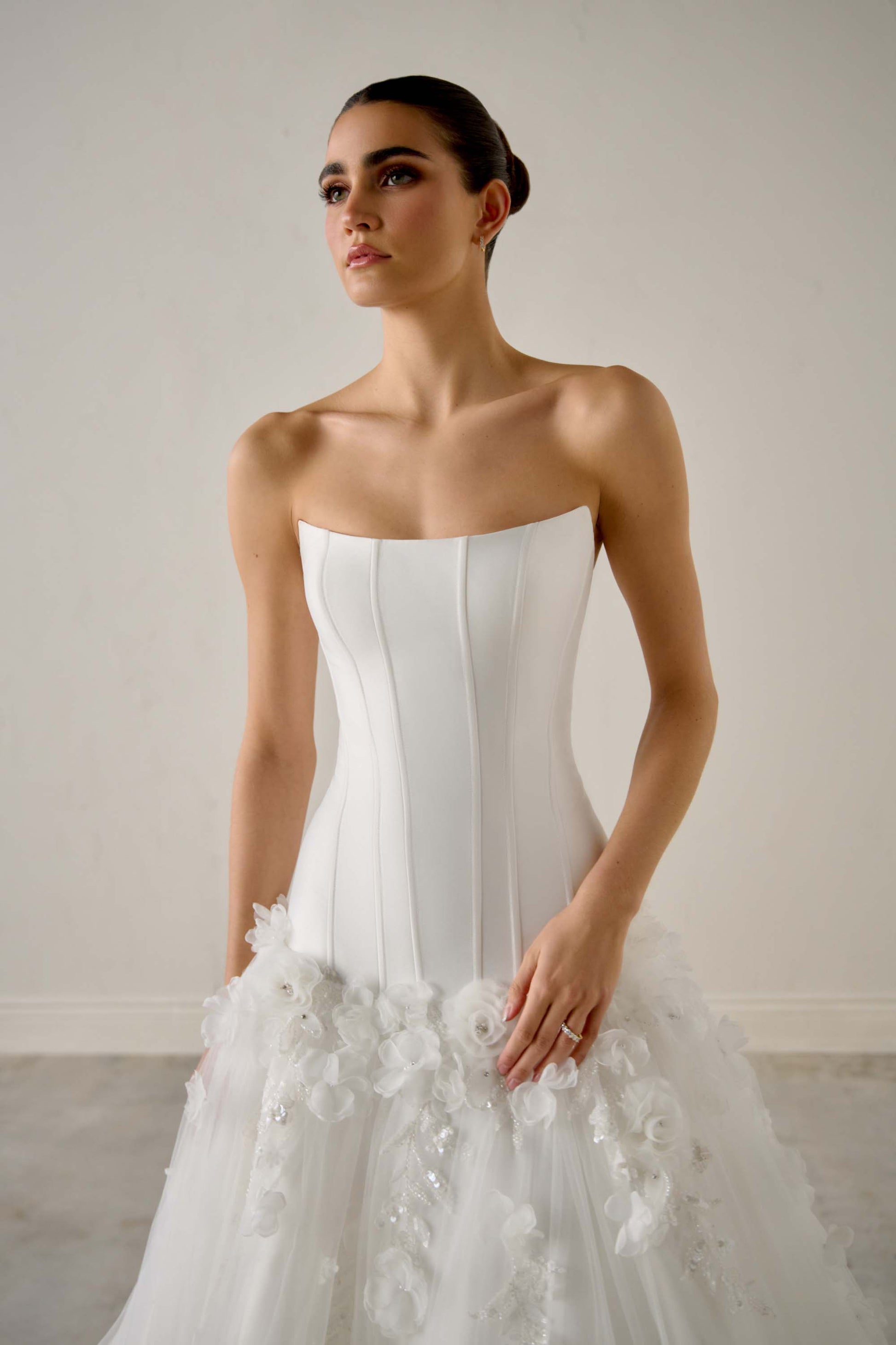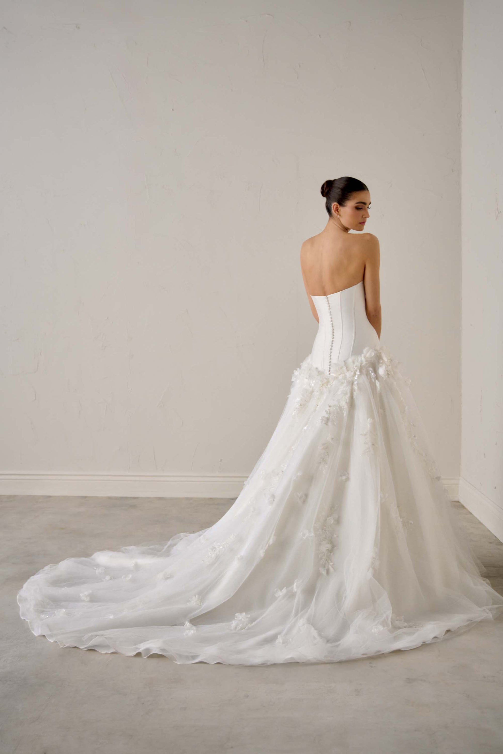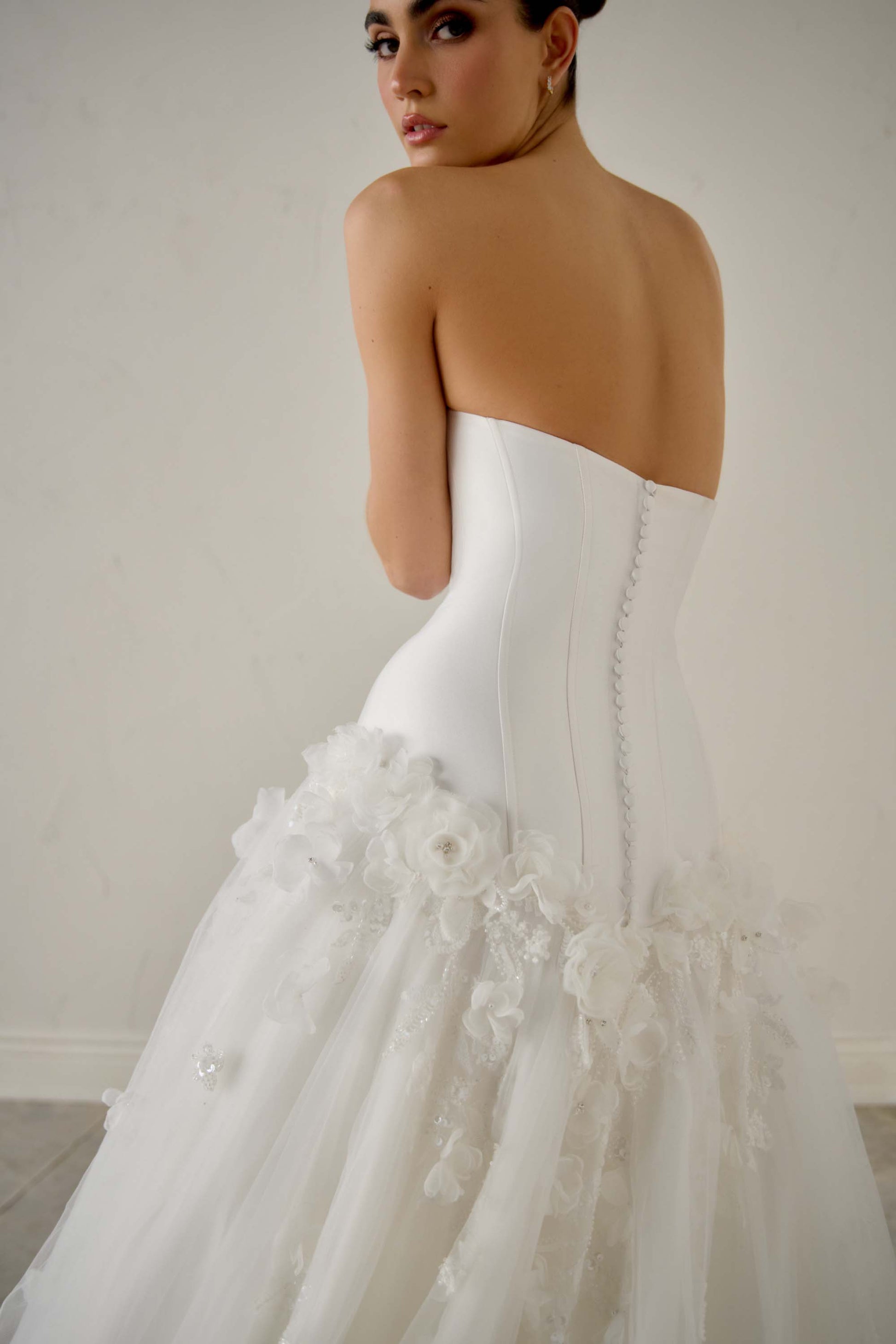 DESCRIPTION : Dress Only FABRIC : Tulle, Mikado, Crystal Embroidery, Satin Lining, Beaded and Sequined Lace Appliques, Pearl Embroidery, 3D Organza Flowers OPTIONS : L, S