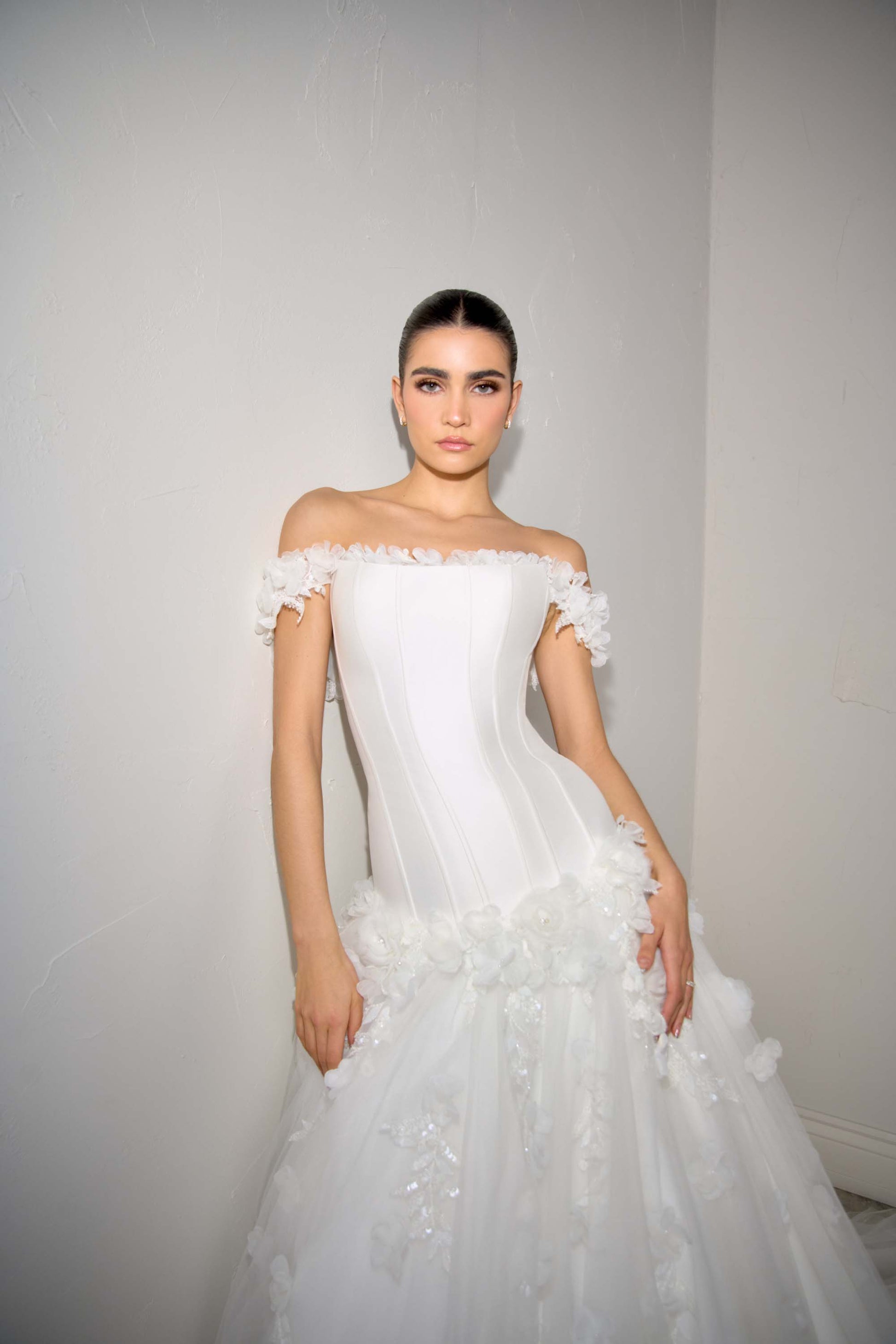 DESCRIPTION : Detachable Straps FABRIC : Tulle, Crystal Embroidery, Beaded and Sequined Lace Appliques, Organza, Pearl Embroidery, 3D Organza Flowers OPTIONS :