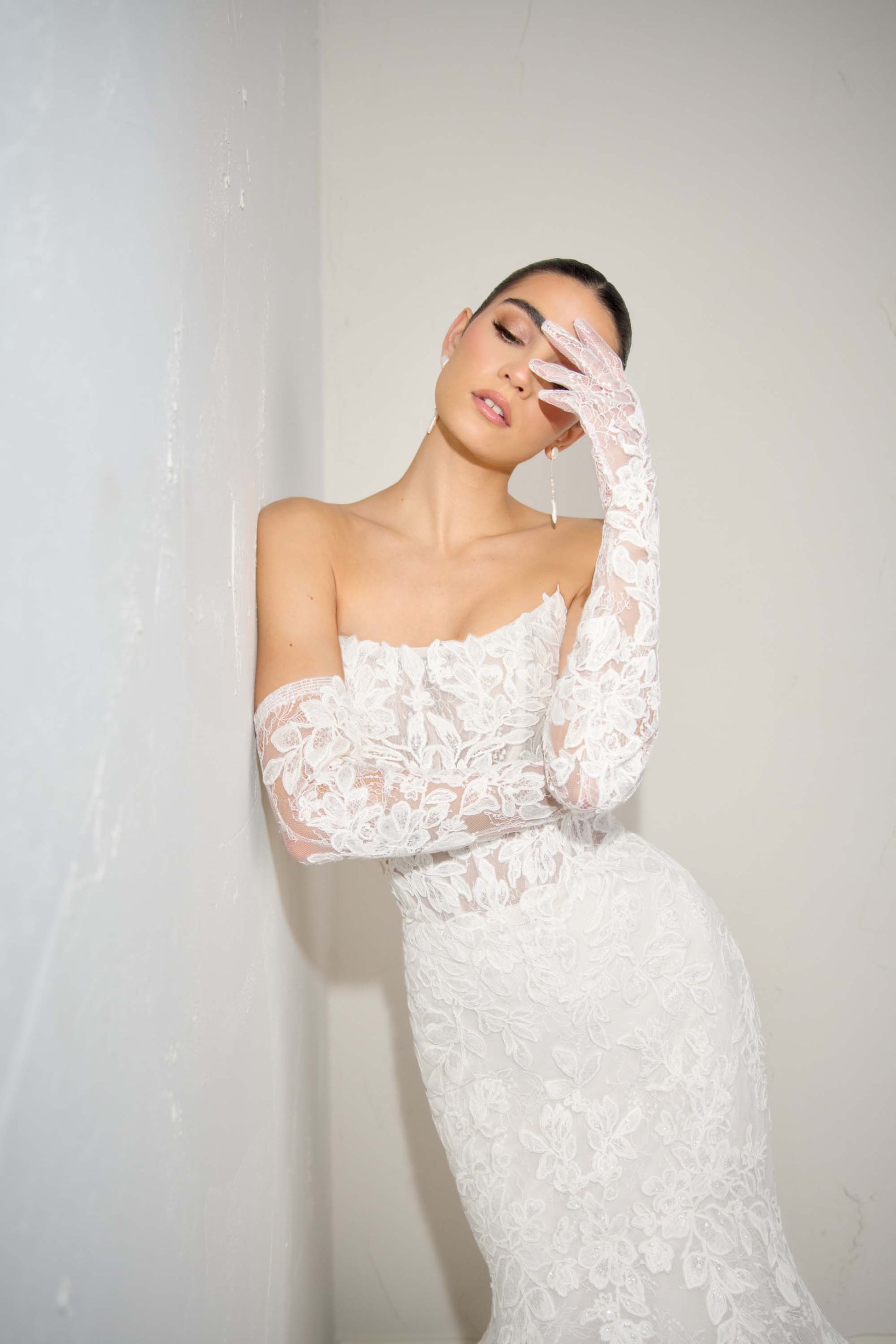 DESCRIPTION : Detachable Gloves FABRIC : Chantilly Lace, Corded Lace Appliques OPTIONS :