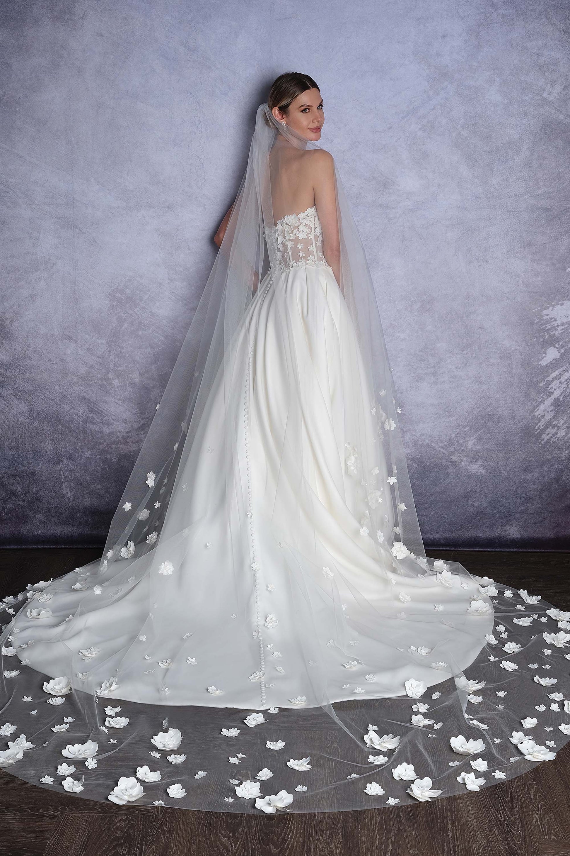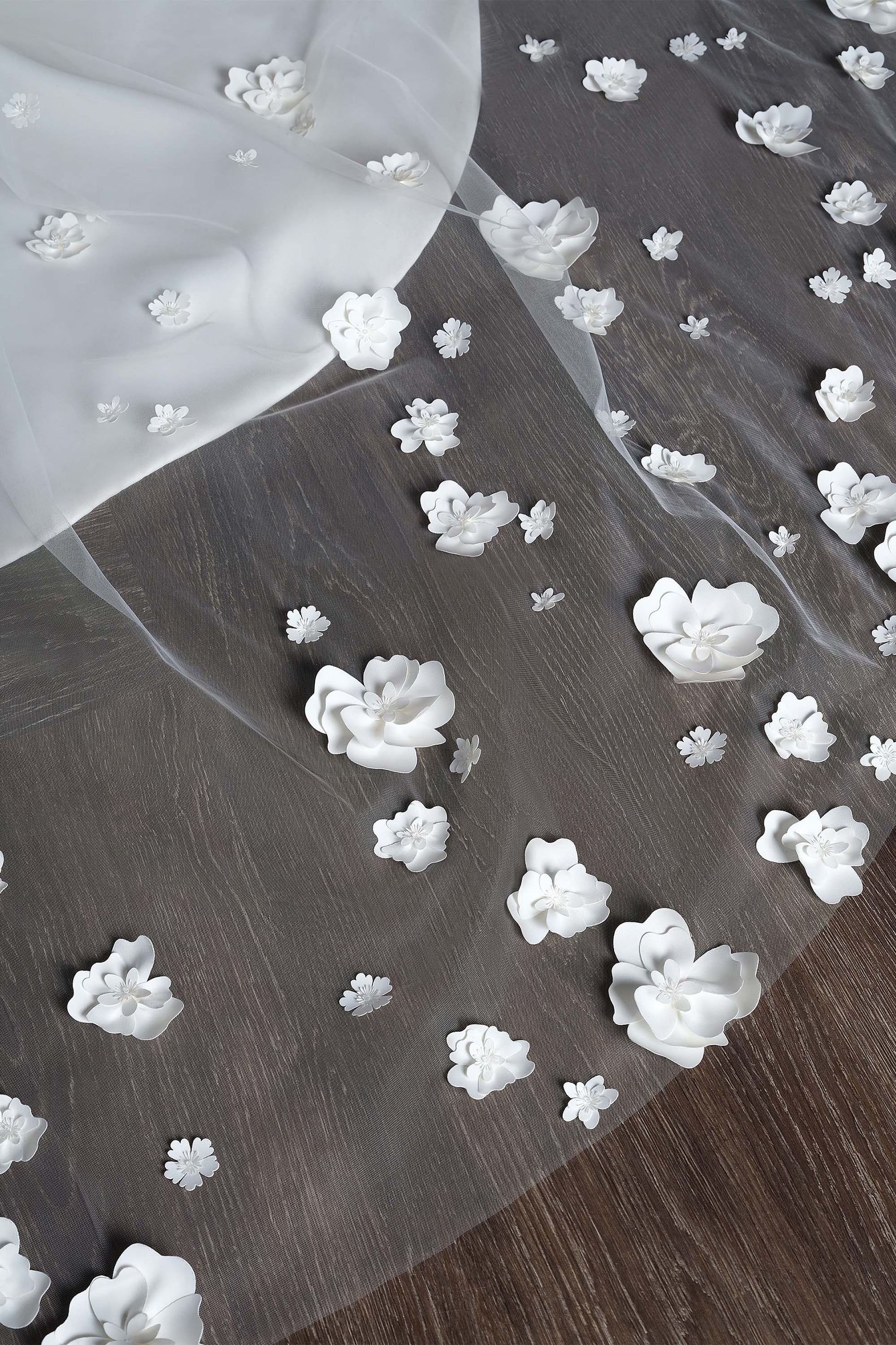 Cathedral Length Veil 3D beaded laser cut lace flowers, Tulle