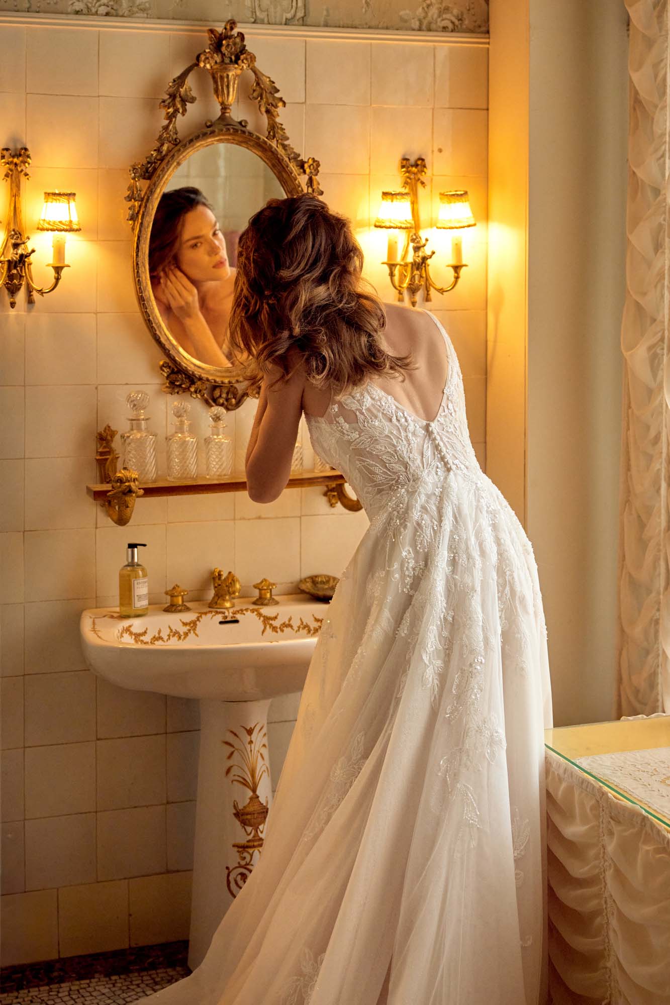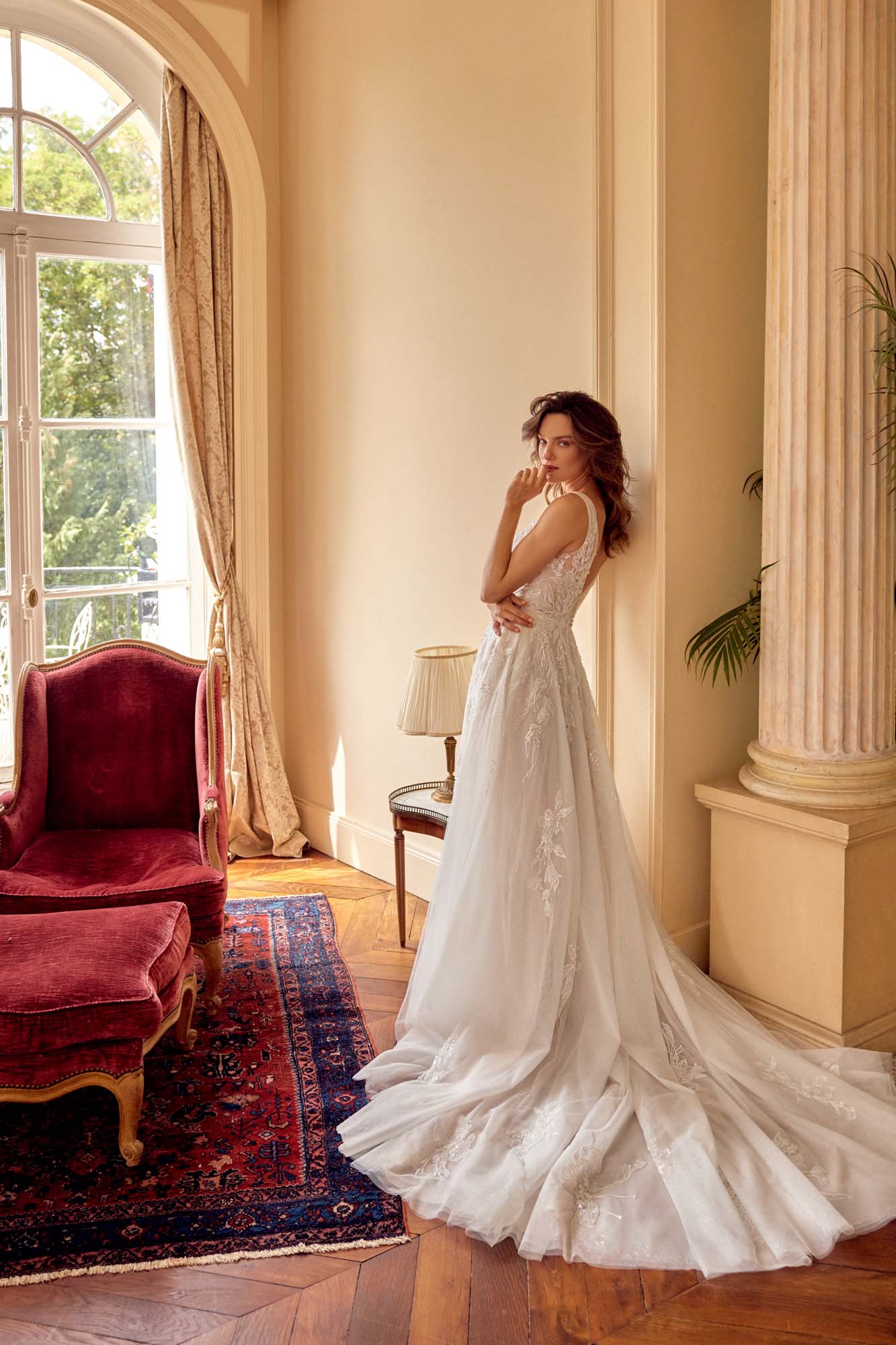 DESCRIPTION : Dress with Plunging Neckline and Unlined Bodice FABRIC : Beaded and Sequined Lace Appliques, Tulle, Sparkle Tulle, Woven Lining, Tulle, Hard Tulle OPTIONS : L, S