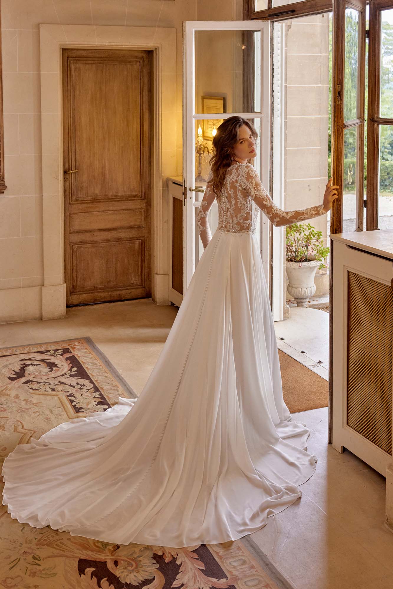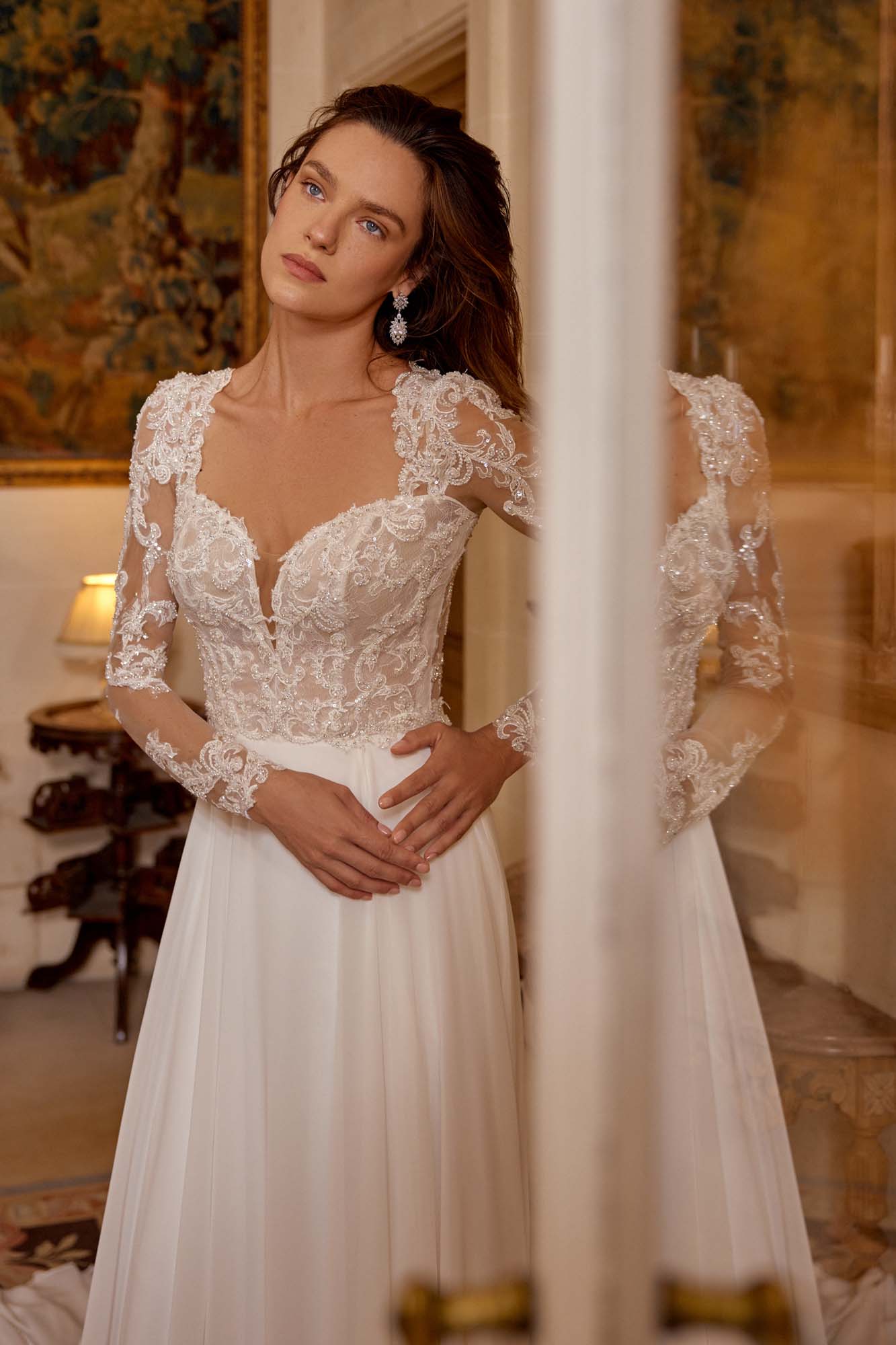 DESCRIPTION : Dress with Raised Neckline and Unlined Bodice FABRIC : Chantilly Lace, Beaded Lace Appliques, Tulle, Woven Lining, Chiffon, Organza OPTIONS : L