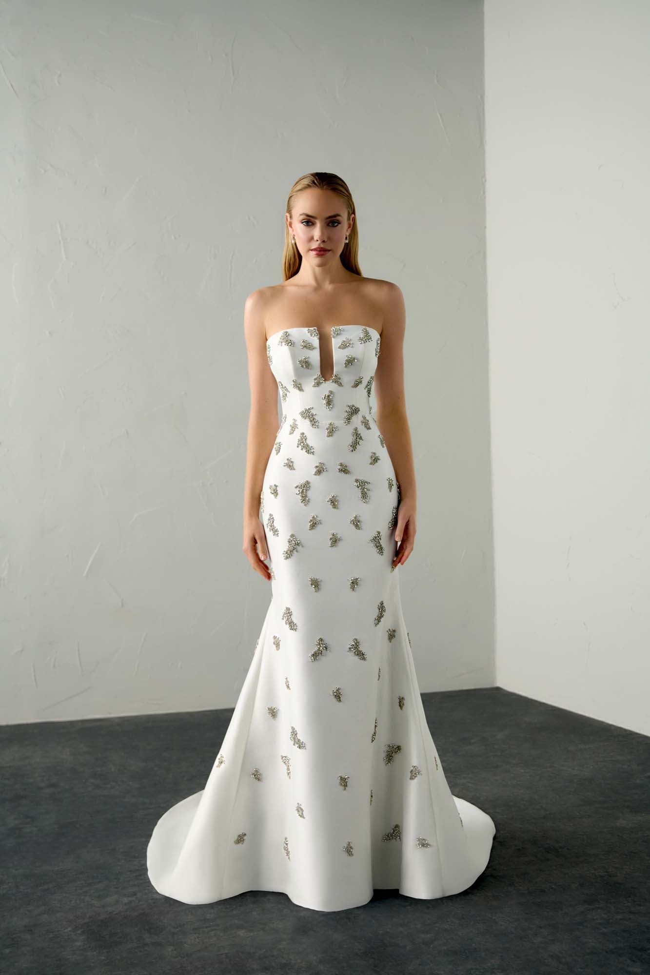 Dress with Closed Neckline FABRICS : Stretch Mikado, Woven Lining, Crystal Beading OPTIONS : PT, U